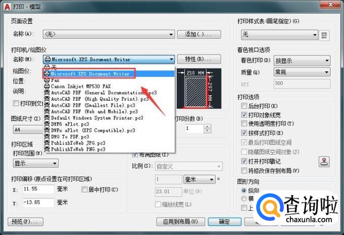 点击打印选项,在弹出的对话框内我们找到打印机绘图仪名称选项,在这里选择我们的打印机型号,如图所示: