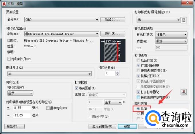 再在右侧找到图形方向选项,设置打印的方向,然后点击确定就可以打印出A3图纸了,如图所示: