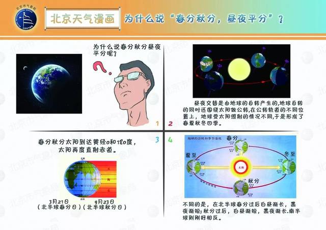 在春分(太阳到达黄经0°)这一天,太阳刚好直射赤道,此时,晨昏线经过南北极点,与地球的经圈重合,将所有纬线平分为两部分,一半位于昼半球,另一半位于夜半球,所以这一天全球昼夜几乎相等。秋分(太阳到达黄经180°)同理,太阳再度直射赤道,全球昼夜再次相等。所以说春分秋分,昼夜平分。