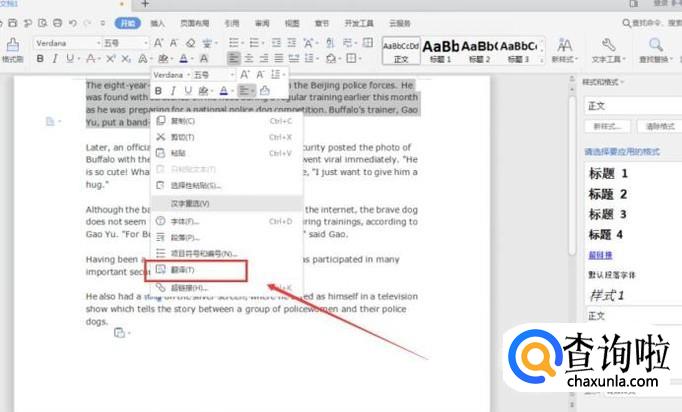 然后选择要翻译的段落,鼠标右击,选择【翻译】,如下图所示: