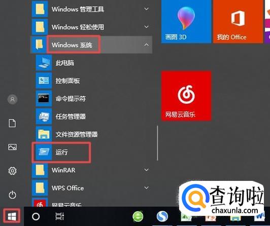 首先,我们点击开始,弹出的界面,我们点击windows系统,弹出的界面,我们点击运行;