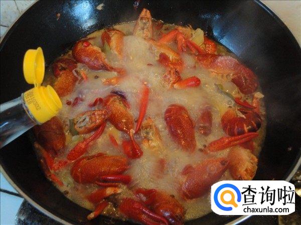 待小龙虾变色后加入少量水、火锅底料、白酒、白糖、适量盐。