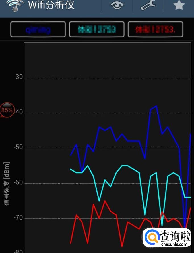 选择“信号强度表”,则会以波峰线的形式显示强度的对比,可以看到仍然是蓝色网络信号强。
