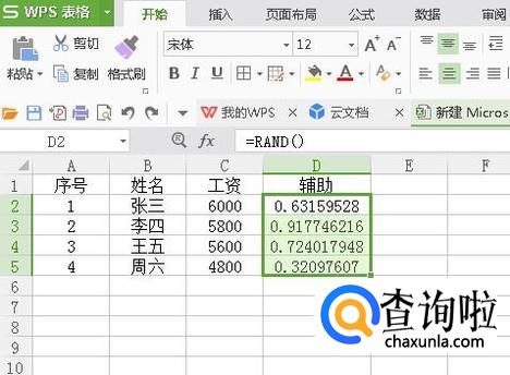 D2单元格出现一个随机数值(介于0~1之间),如图所示,然后我们向下填充格式,造一个辅助列。