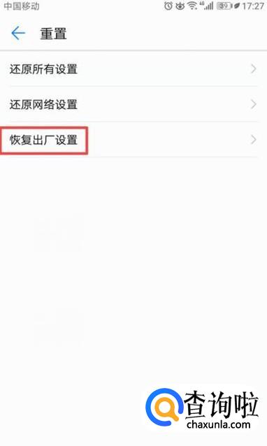 弹出的界面,我们点击恢复出厂设置,如图所示;