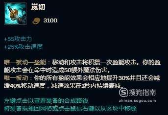 第三件装备选择岚切,这件装备可以在第一次攻击的时候,提供一次物理暴击,加上电刀,就有两种暴击伤害了。