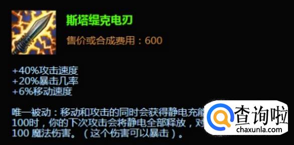 第一件装备选择电刀,这件装备可以增加亚索的移动速度、攻击速度,更提高了的暴击率,一刀打出爆发伤害。