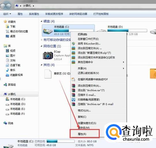 接着选中C盘后鼠标右键点击一下,然后再点击【属性】功能。
