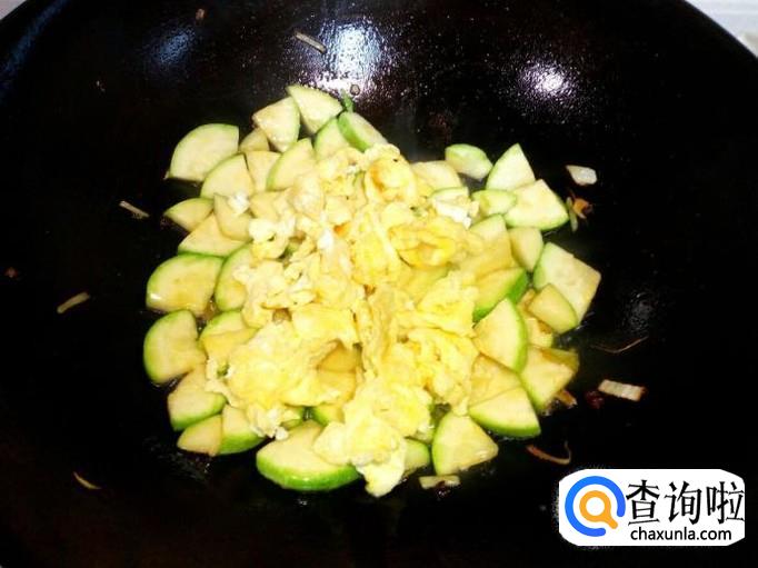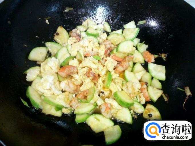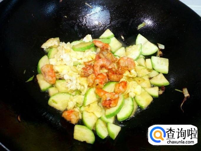 炒至角瓜断生,放入炒好的鸡蛋,鸡蛋略翻炒一下,放入炒好的虾仁。