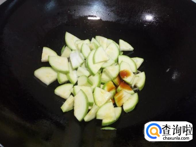 锅里放入油加热,油热后放入花椒,葱,姜爆锅。放入角瓜翻炒,放入少许料酒,少许蚝油,盐。