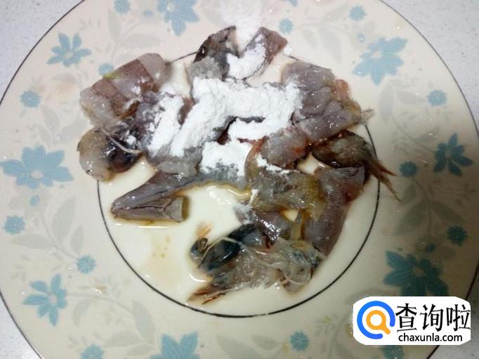 虾剥去皮,用水清洗干净,控干水分。把剥好的虾仁,用刀切成段,放入少许盐,料酒,淀粉,拌和均匀,腌制15分钟。