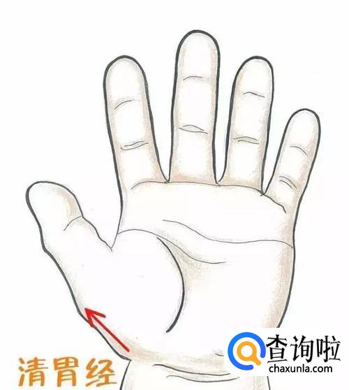 胃经在拇指掌面近掌端第一节,向指根方向直推100次,具有清脾胃湿热和胃降逆的作用。