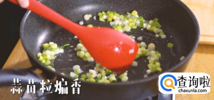锅中热油,放入蒜苗煸香。