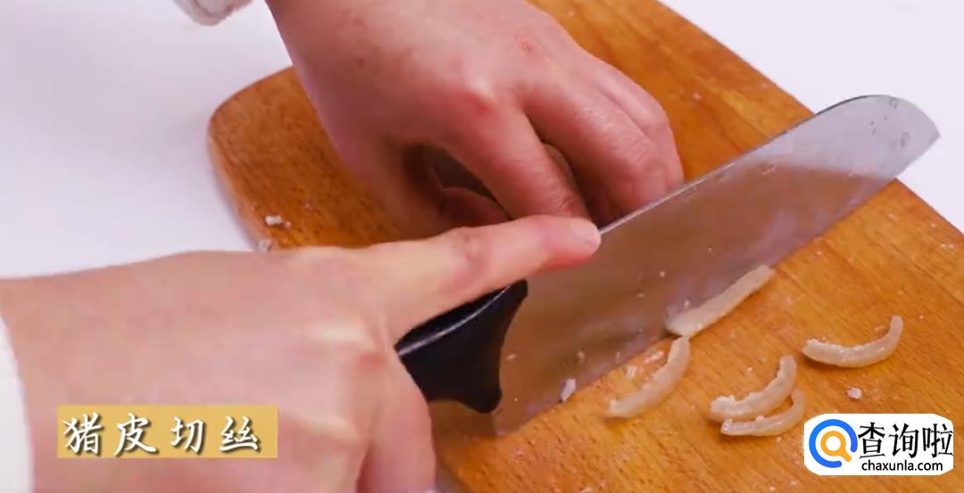 焯水后,将猪皮切丝。