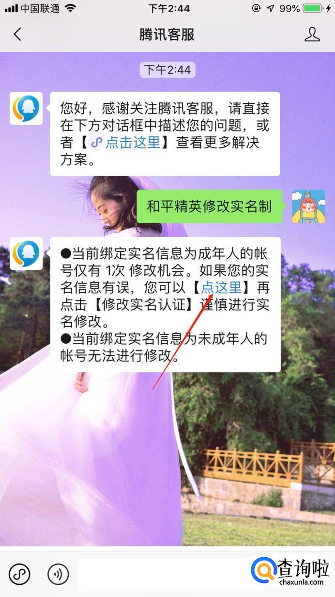 然后我们就进入到了与腾讯客服的聊天框中,在框中输入“和平精英修改实名制”,它会回复一段话,我们点击中间的“点这里”。