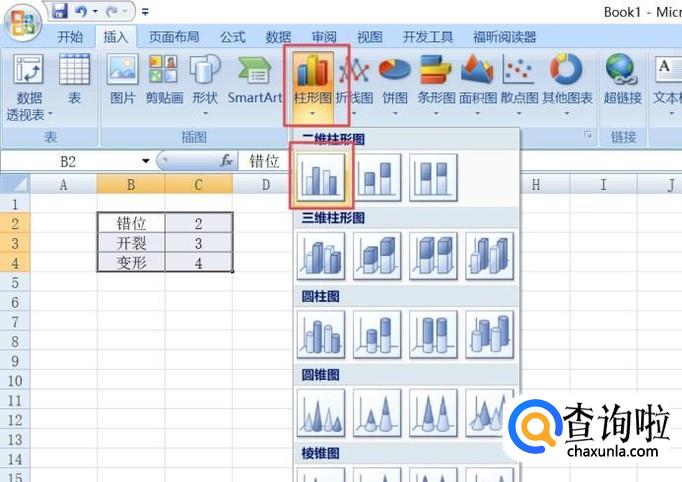 之后我们点击柱形图的下拉箭头,弹出的界面,我们点击第一个;