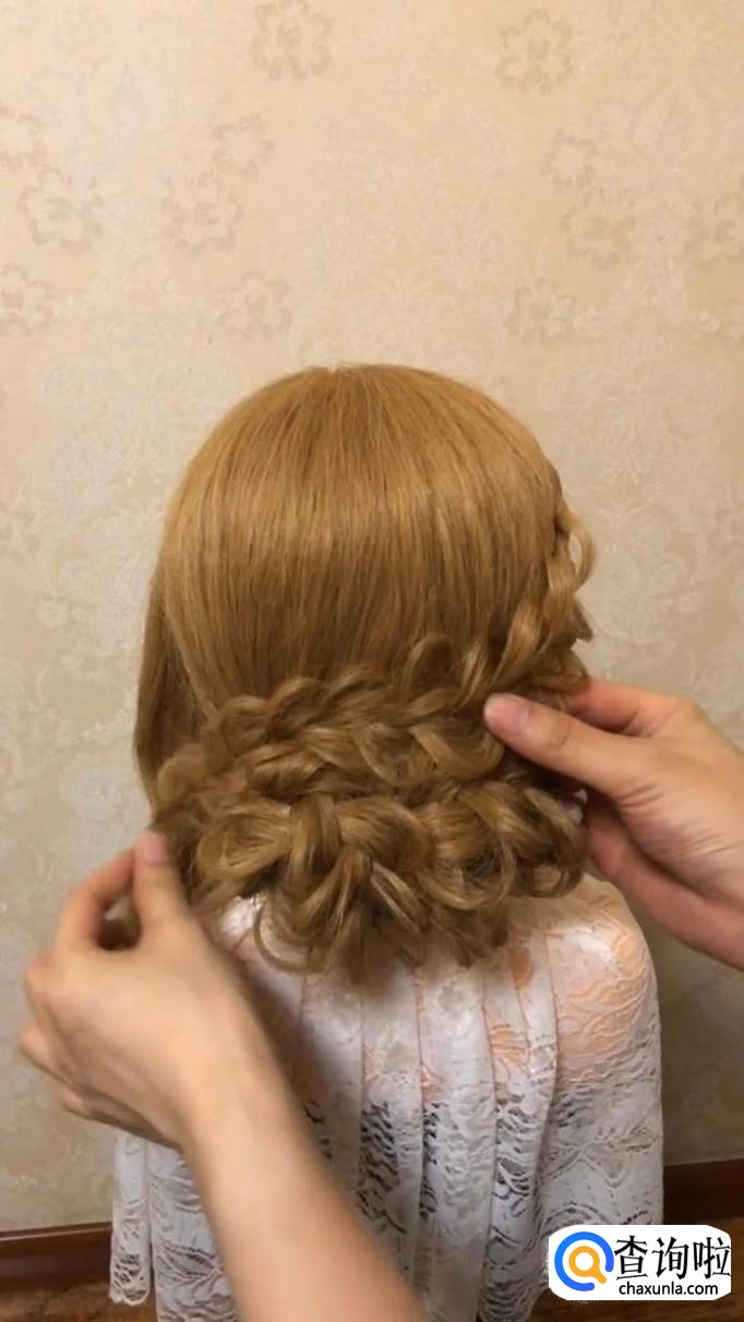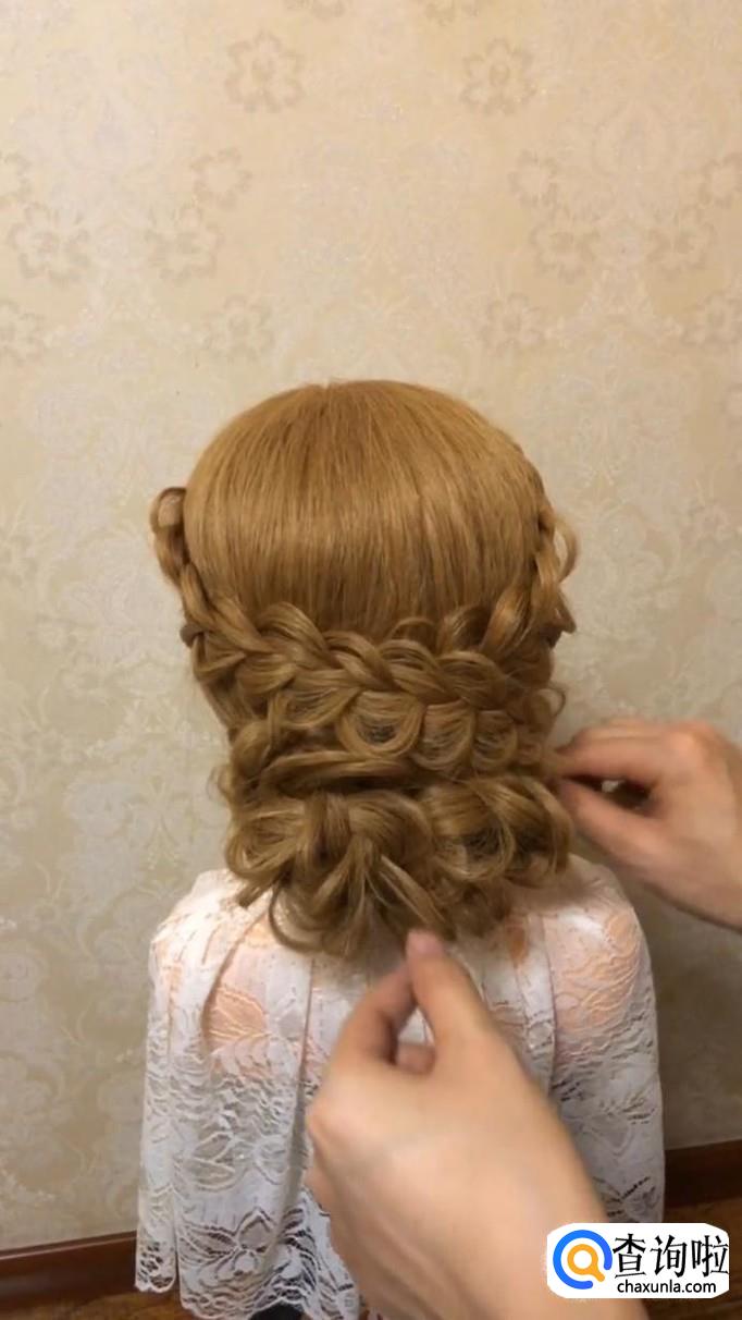 再将左前方的头发也同样编好后,固定在盘发的上面,形成交叉状。