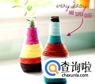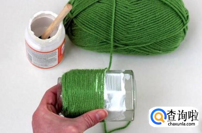 然后把挑选好的毛线,一层一层,一圈一圈的缠绕在玻璃瓶上面,记住一定要把毛线绷直,要不然做出来的效果不好,然后缠绕完成后我们要把最后的线头用胶水粘紧,为了美观我们可以在接口处放一些小饰品遮挡。