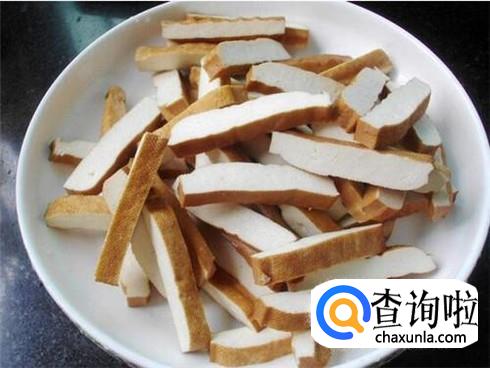 热锅下油,放入姜蒜一起煸香,然后把香干倒入锅中,加入适量的盐和清水,把香干炒软。