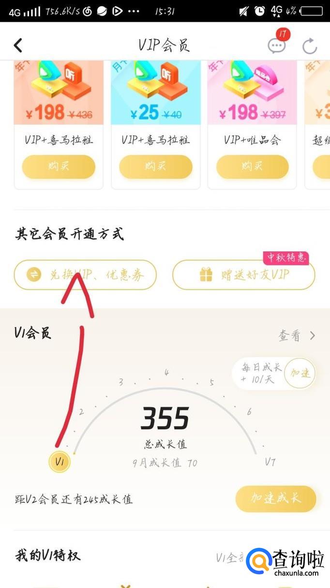 向下滑动手机,点击“兑换vip和优惠券”选项,如图1箭头所示。会出现一个新的界面,输入你的兑换码就可以了。