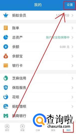 首先,打开手机支付宝,从下方的菜单栏中点击“我的”进入个人中心,并点击界面右上角的“设置”选项。