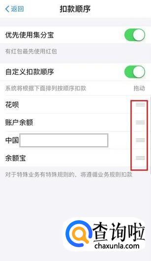 打开“自定义扣款顺序”的开关后,通过拖动对应的支付选项来修改支付的优先顺序。