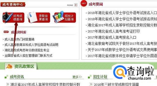 在“成考查询中心”点击“成考成绩查询”,输入身份证或者准考证、报名号即可查询了。