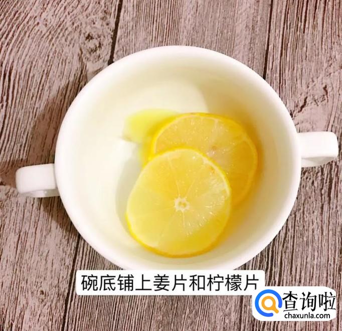 然后将柠檬用盐巴反复搓洗干净,切成薄片,之后把姜片和柠檬片铺在碗底,如下图所示。