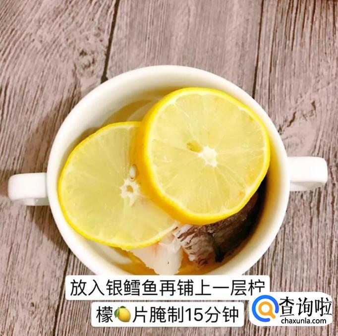 然后放入银鳕鱼并在上面再铺上一层柠檬片,腌制15分钟,如下图所示。