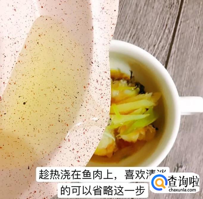 然后锅中放入适量的食用油,待油烧至冒烟,浇淋在鱼肉上,如下图所示。