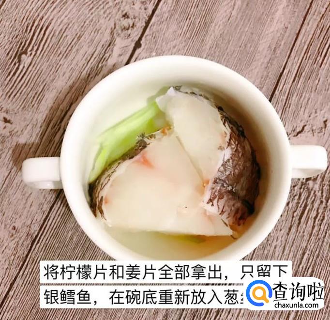 接着将柠檬片和姜片全部拿走只留下银鳕鱼,在碗底重新放入葱丝和姜丝,如下图所示。
