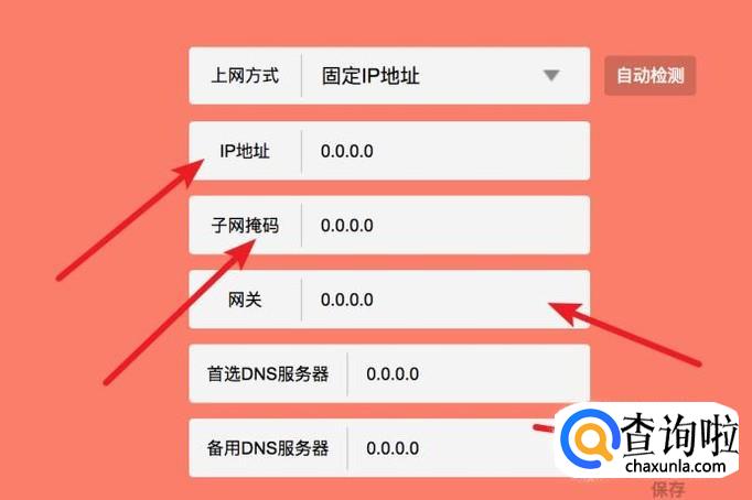 然后填上你宽带商给你的固定的IP地址,子网掩码和网关信息就行了,点击保存按钮后就能正常使用了。