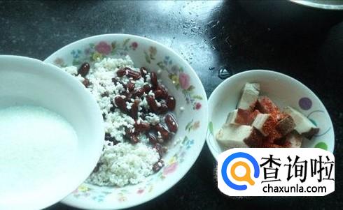 首先将东坡肉切丁,把红豆还有糯米洗干净之后用清水泡半天。