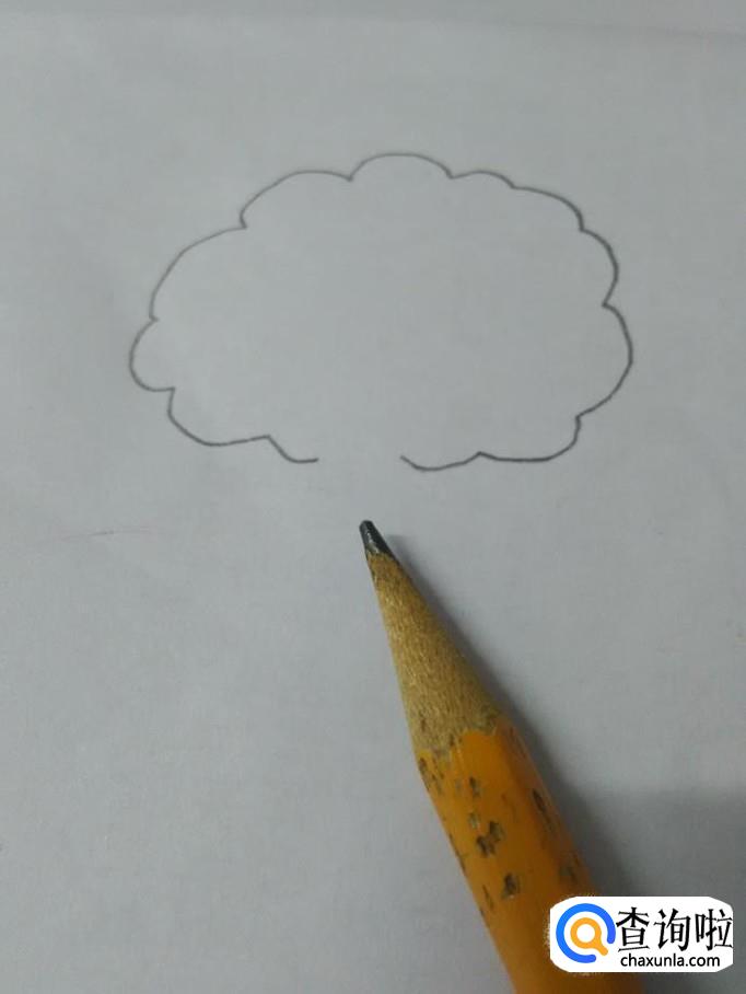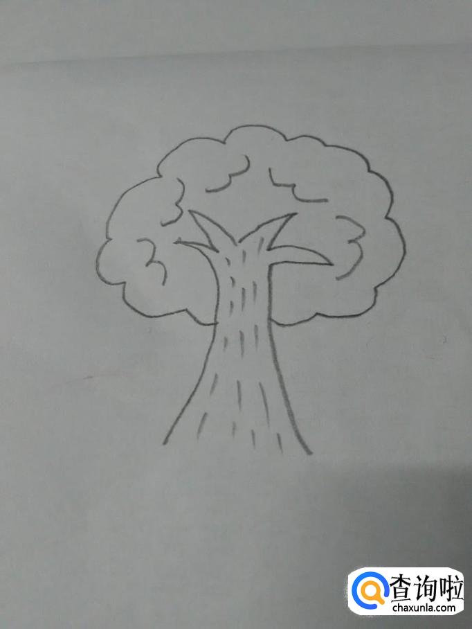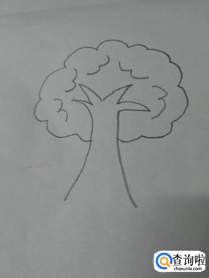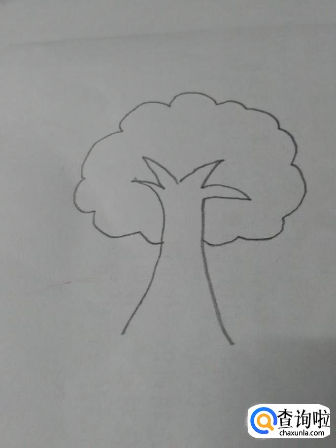在树冠中间画几个相连的尖状,表示树杈,然后从两侧往下画两条弧线,越往下越宽,表示树干。