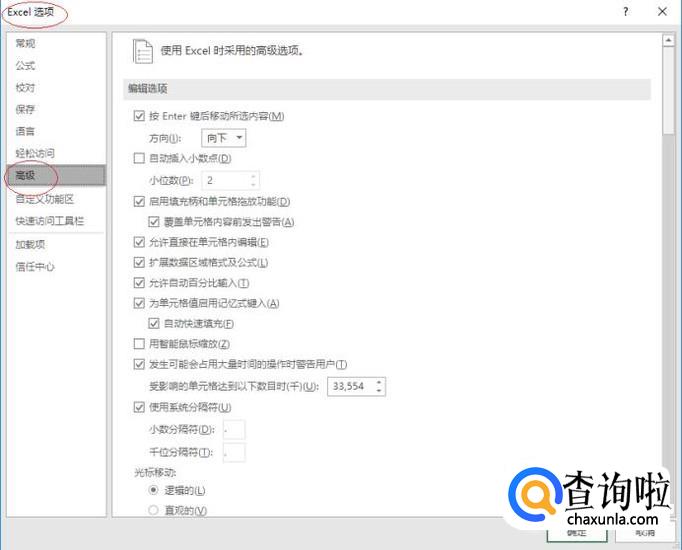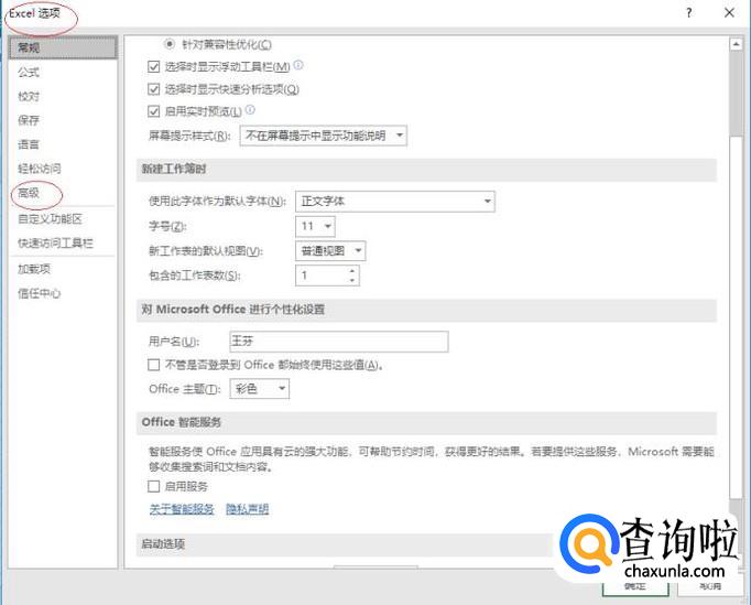 弹出"Excel 选项"对话框,选择左侧"高级"项。