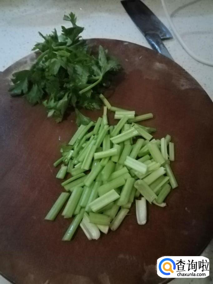 把芹菜洗干净,叶子和根茎部分分开,然后把根茎部分切成小段状,叶子不切,然后装在一起备用。