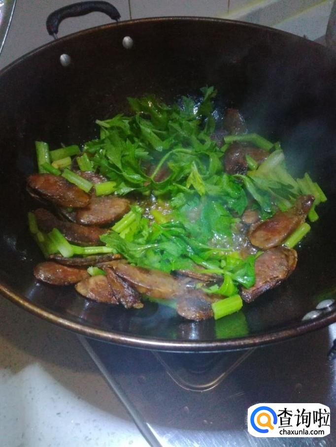 接着将备好的芹菜叶倒入锅里,同样用铲子搅匀。