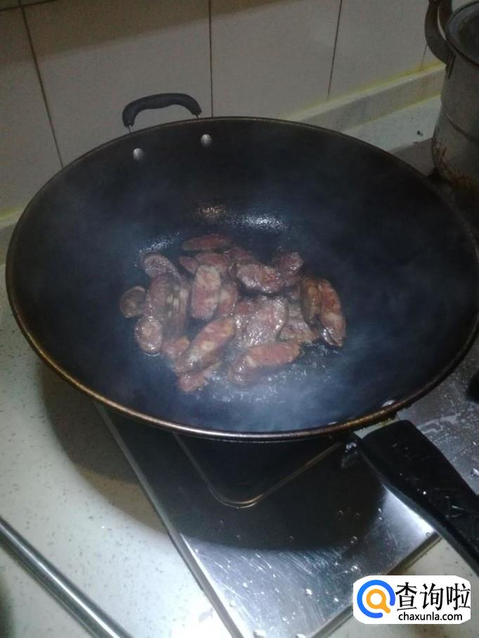 然后把备好的香肠倒入锅里,转中火,用铲子翻炒。