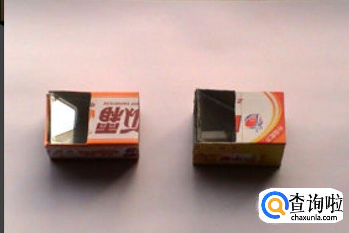 准备好牙膏盒,计算得到合适的镜子,将一个牙膏盒从中剪开,剪成如图状,装入镜子,镜子与盒壁成45度夹角,镜子后面可做个45度的直角三角形垫着会更稳。
