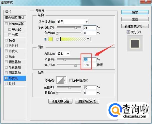 点击外发光选项在弹出的对话框内设置参数如图所示:
