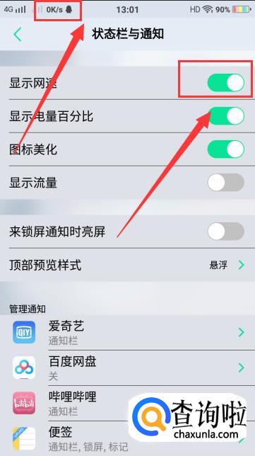 进入【状态栏与通知】页面后,找到【显示网速】,这时时处于关闭状态的,将其开启,就可以在手机顶部显示实时网速了。