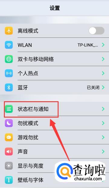 在【设置】页面,找到【状态栏与通知】并点击。