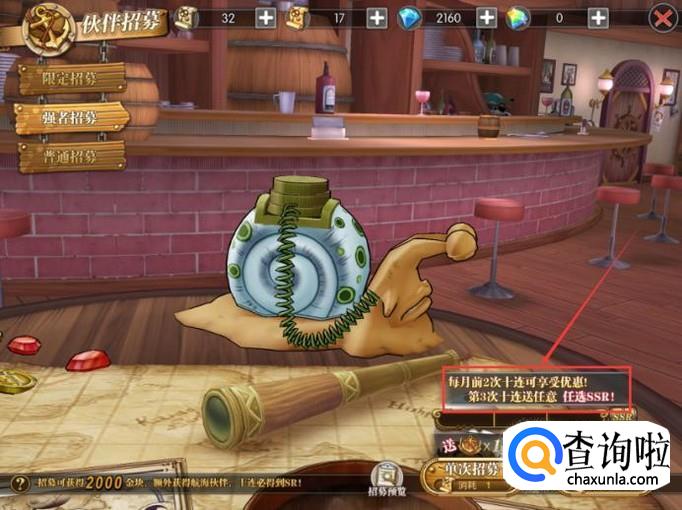 进入到【强者招募】页面后,玩家每月第三次十连抽就能百分百获得SSR级伙伴。