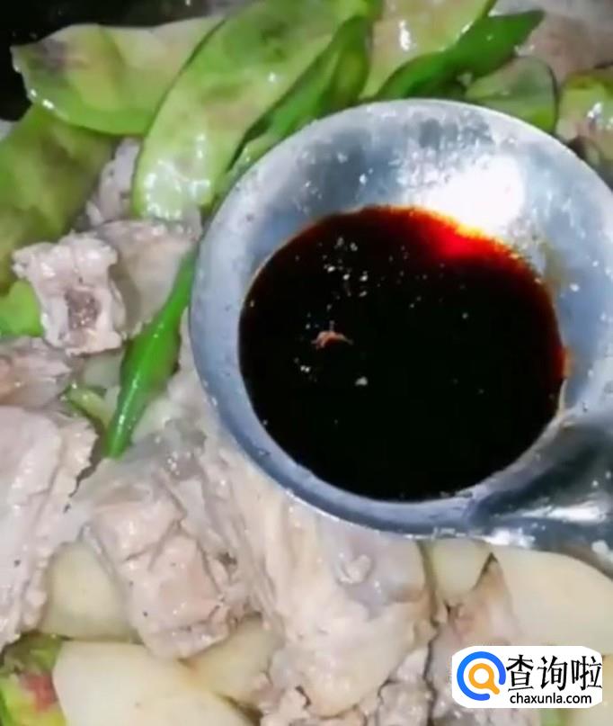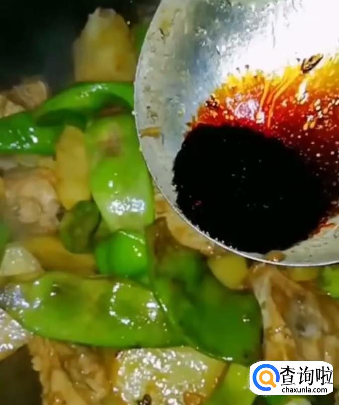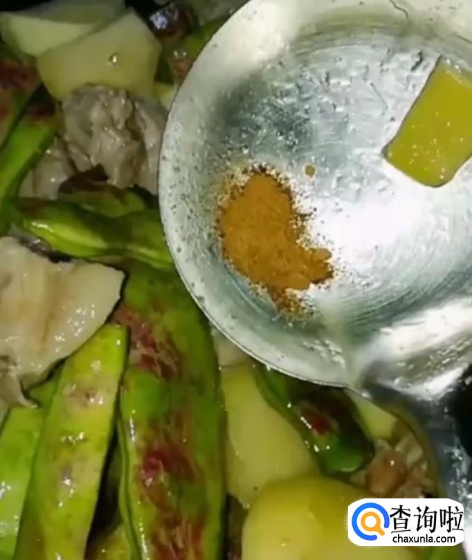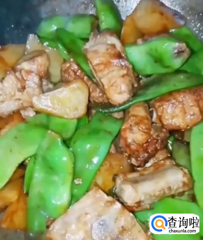然后我们再放入排骨,土豆与豆角,加入少许的十三香,酱油,老抽调色