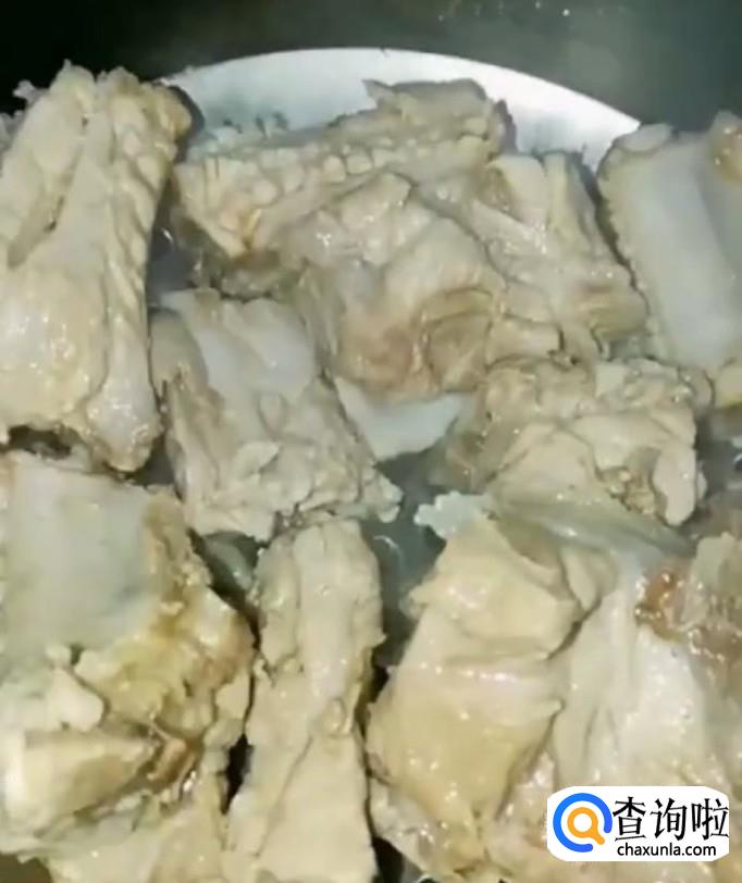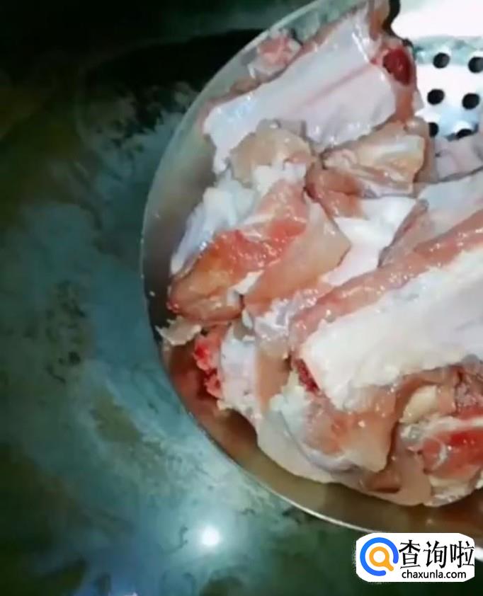 然后我们在锅中烧水,放入少许料酒,放入排骨,焯一下,捞出备用