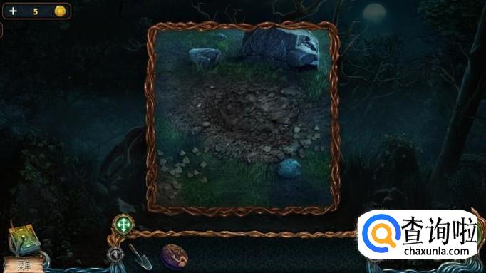退出拼图的界面,点击大树下方的那片土地,用铲子铲掉上面的土,就可以得到一块木雕。在树的左下方我们还可以再捡到一块木雕。