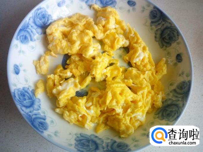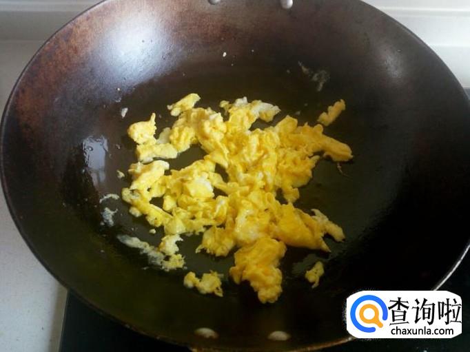 用锅先把鸡蛋炒出来,炒至七分熟即可,装盘备用。