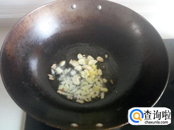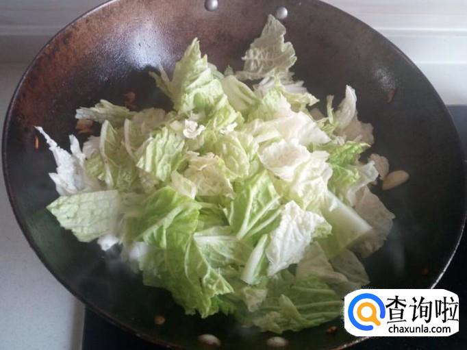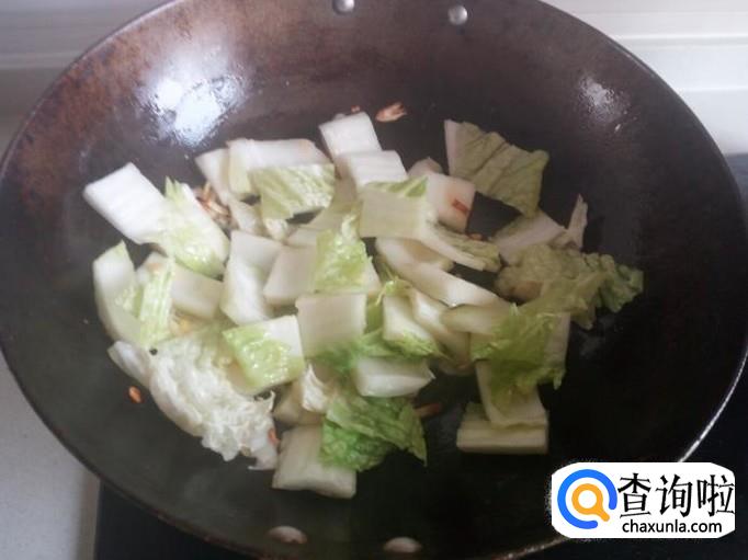 锅内放油加热,油热后放入葱,姜,蒜,爆锅。放入白菜块翻炒,放少许料酒,五香粉,盐。