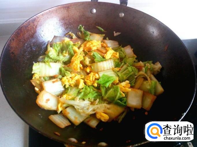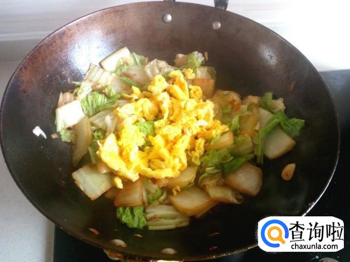 炒至白菜断生,放入鸡蛋,略翻炒一下。放入味精,关火,出勺。