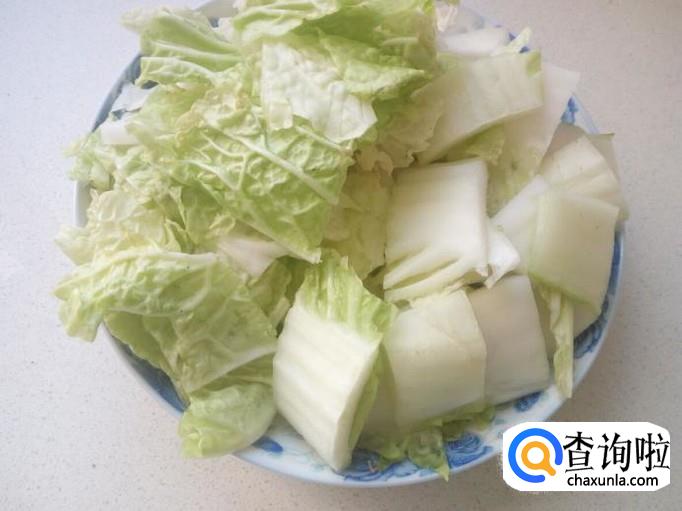 白菜洗净控水,切成3公分大小的块。把切好的白菜块和叶分开装盘。